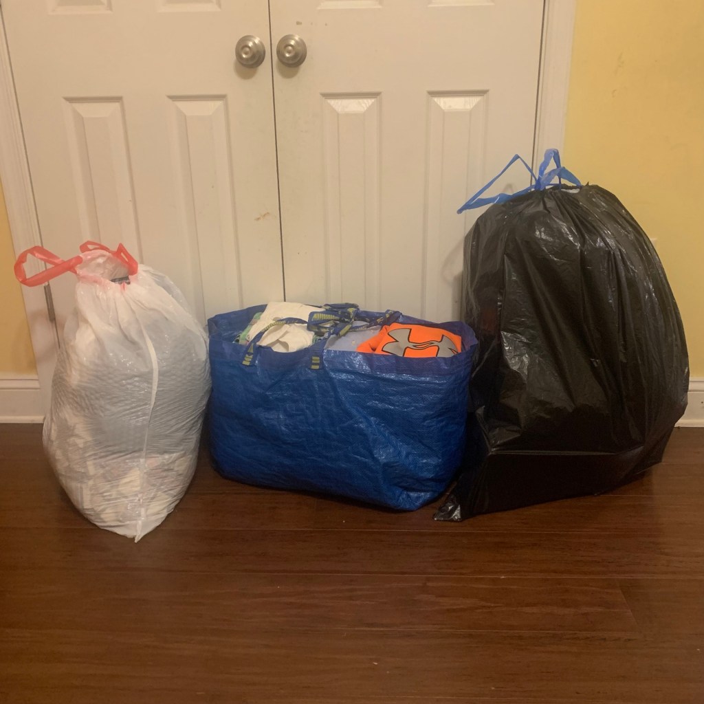 Results: A clean landing and one large bag of garbage, one large bag for the consignment store, and one bag for donations. There were a couple bags of clothes I decided to save for younger siblings for now, and those went into storage.